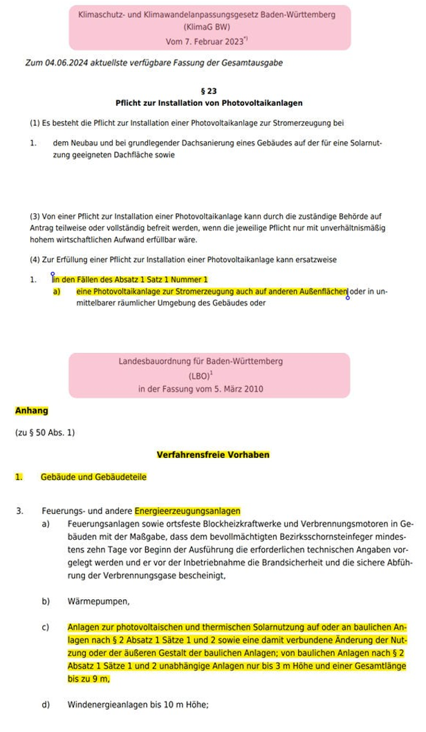 Hier z. B. ein Auszug aus dem Klimaschutzgesetz Baden-Württembergs, bzw. LBO Anhang §50 Abs. 1, Nr. 3.